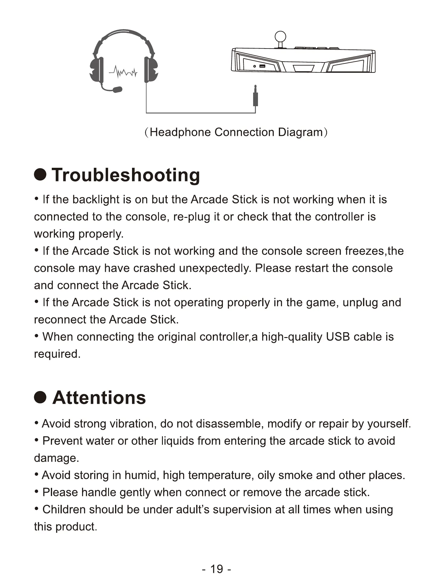 • Prevent water or other liquids from entering the arcade stick to avoid