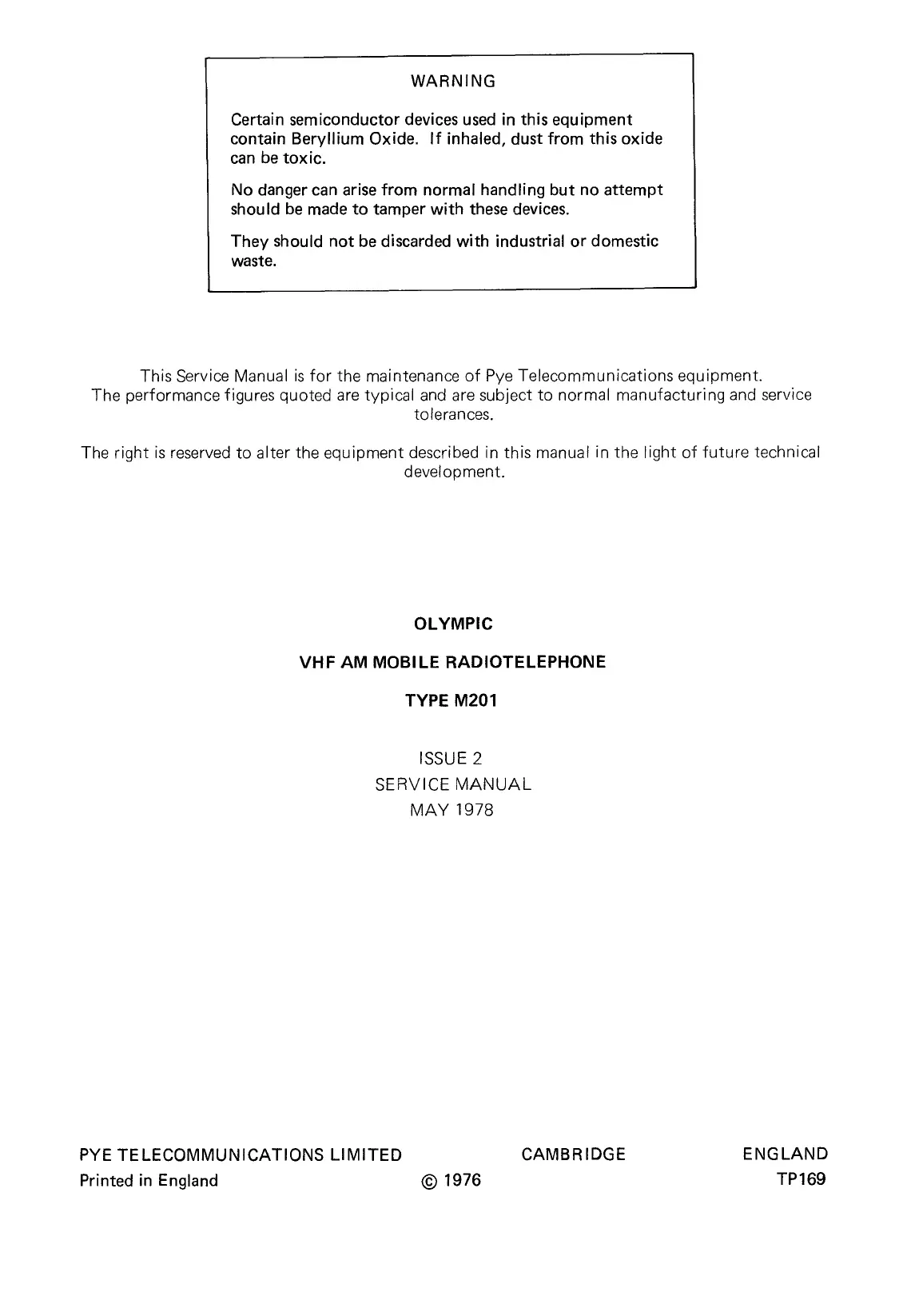 This Service Manual is for the maintenance of Pye Telecommunications equipment.