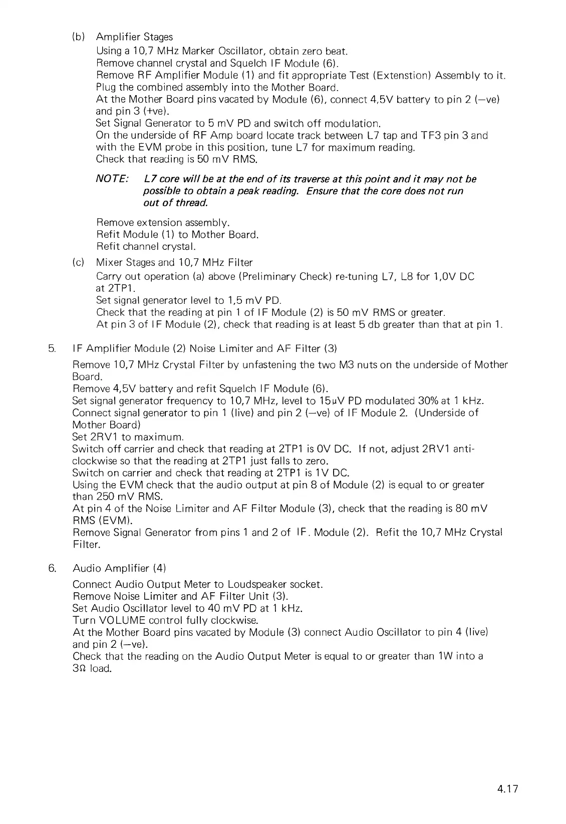 Carry out operation (a) above (Preliminary Check) re-tuning L7, L8 for 1,0V DC