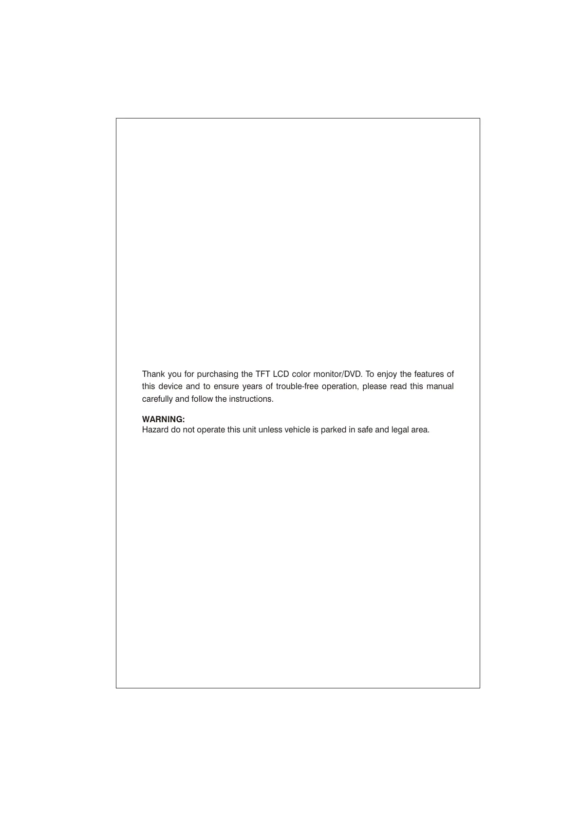 Thank you for purchasing the TFT LCD color monitor/DVD. To enjoy the features of