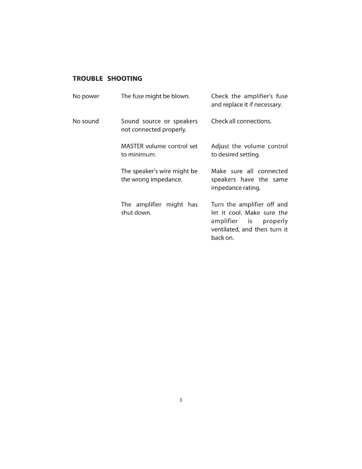 Pyle Pro PCA1 - Troubleshooting Common Issues; No Power; No Sound; Amplifier Shut Down