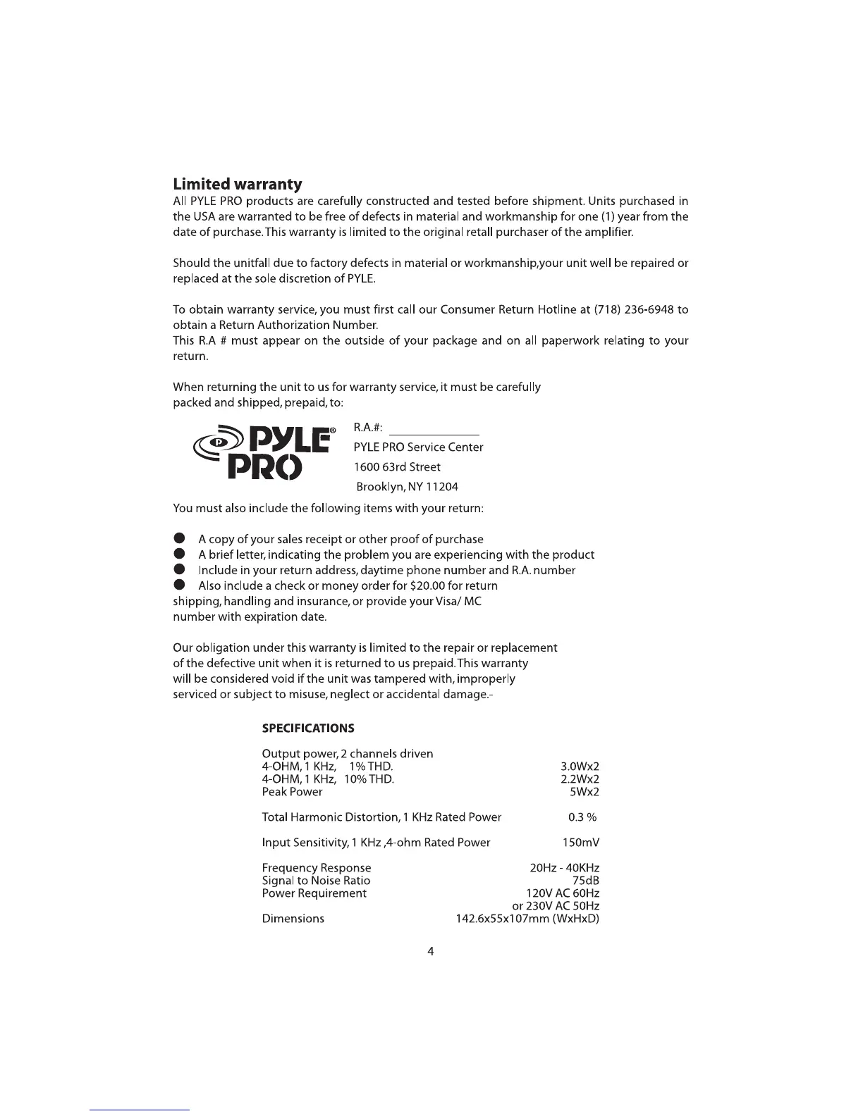 Pyle Pro PCA1 - Warranty and Specifications; Limited Warranty Details; Technical Specifications