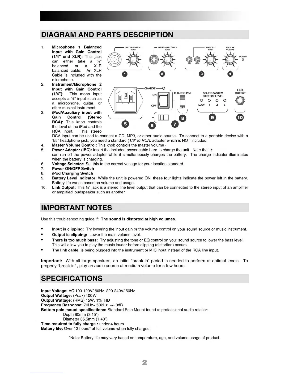Pyle Pro PCMX240I - Diagram and Parts Description; Microphone 1 Balanced Input; Instrument;Microphone 2 Input; iPod;Auxiliary Input
