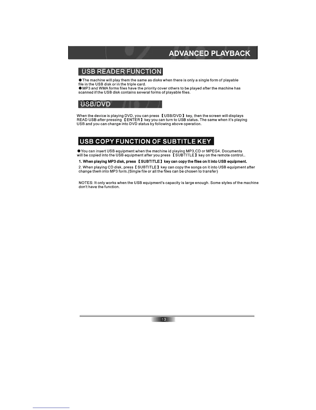 • You can insert USB equipment when the machine id playing MP3,CD or MPEG4. Documents