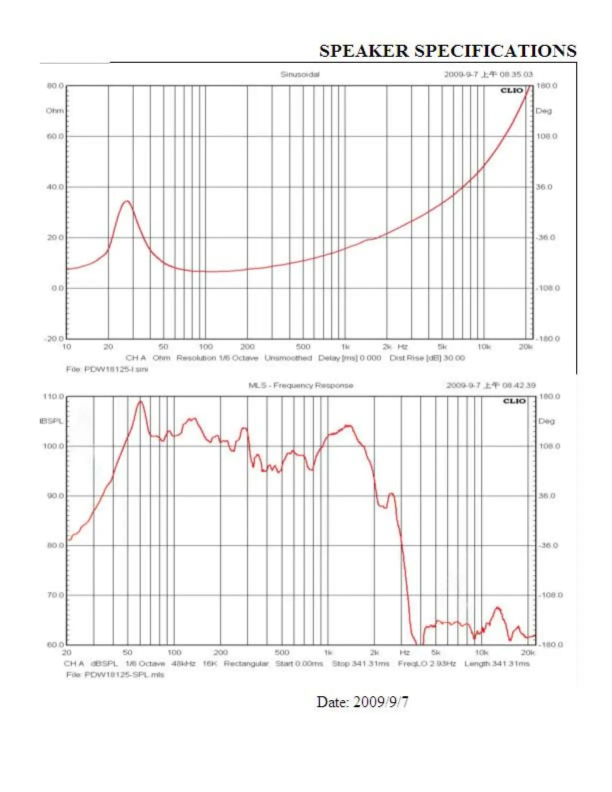 Pyle Pro PDW18125 - Speaker Specifications Graphs; Sinusoidal Impedance Curve; Frequency Response Curve
