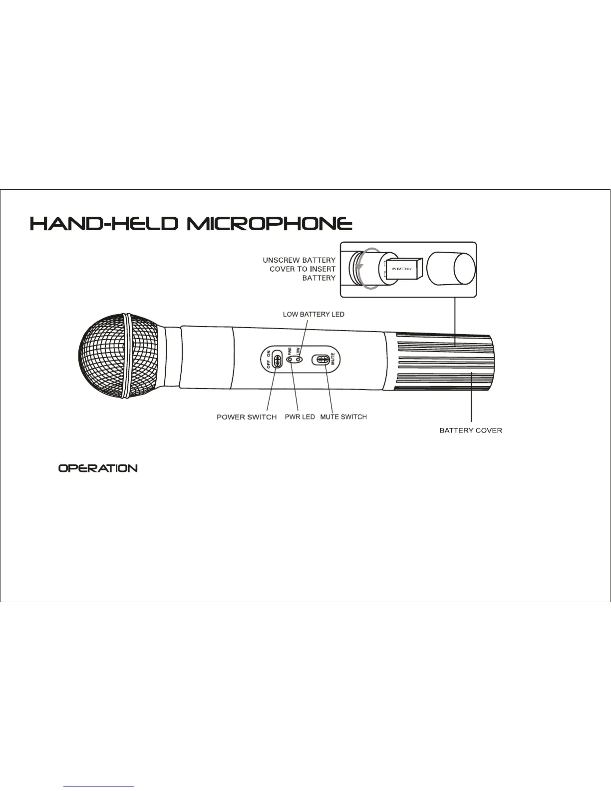 1. Unscrew the battery cover at the end of microphone, put a 9V battery into compartment with