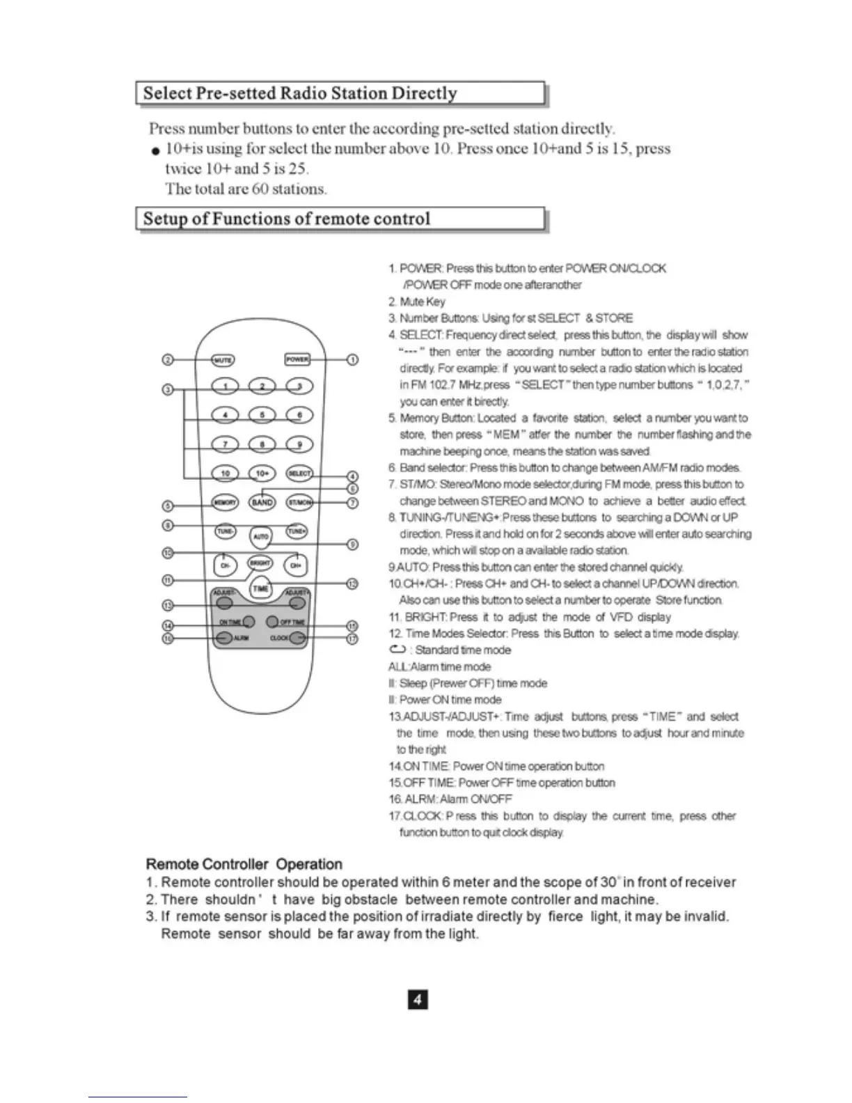 Pyle Pro PT504 - Select Pre-setted Radio Station Directly; Setup of Functions of Remote Control; Remote Controller Operation
