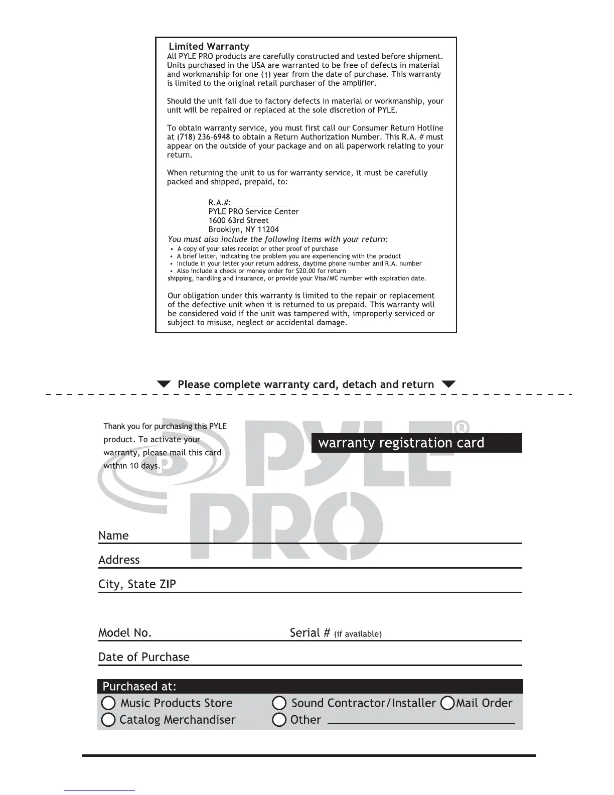 Pyle Pro PTAU45 - Limited Warranty and Service; Warranty Coverage and Duration; Obtaining Warranty Service; Return Requirements