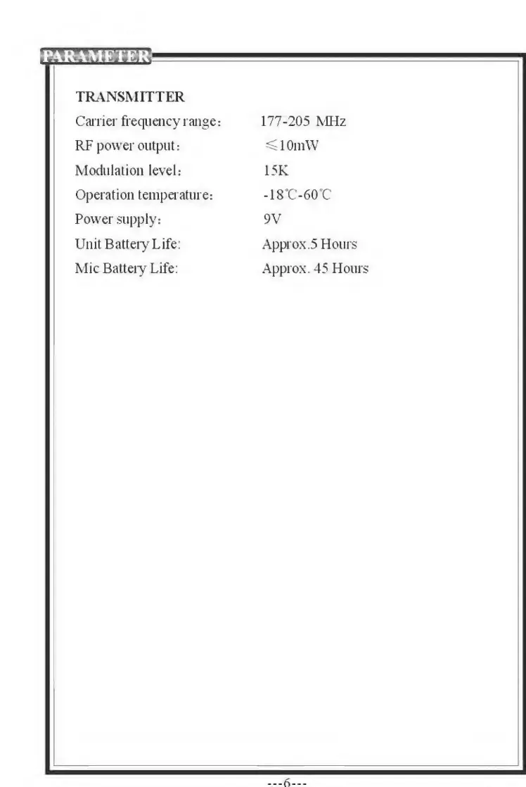 Pyle Pro PWMA-230 - Transmitter Specifications; Transmitter Parameters