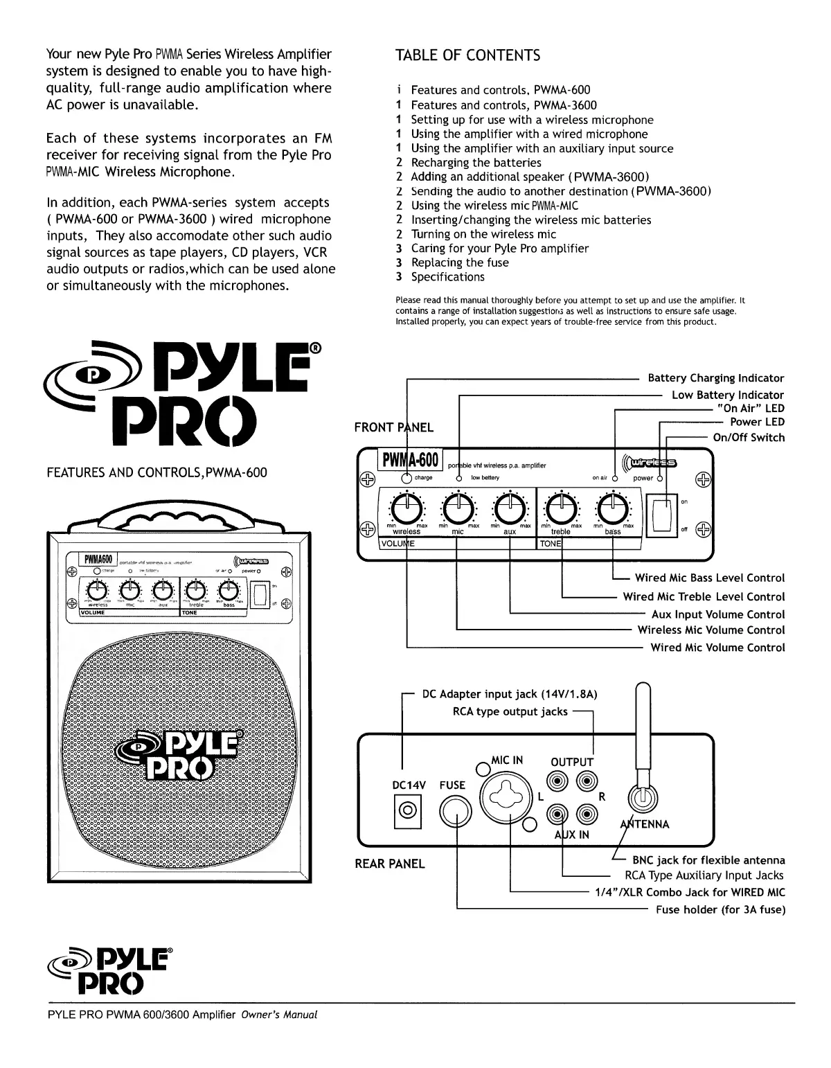 Pyle Pro PWMA600 - PWMA-600 Features and Controls; PWMA-600 Front Panel Overview; PWMA-600 Rear Panel Connectivity