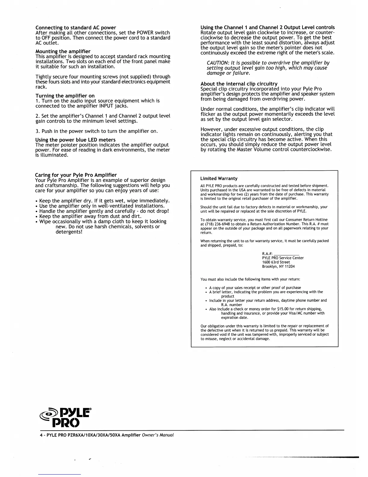 Pyle Pro PZR6XA - Amplifier Operation and Setup; Connecting and Powering On; Operating Controls and Indicators; Warranty Information