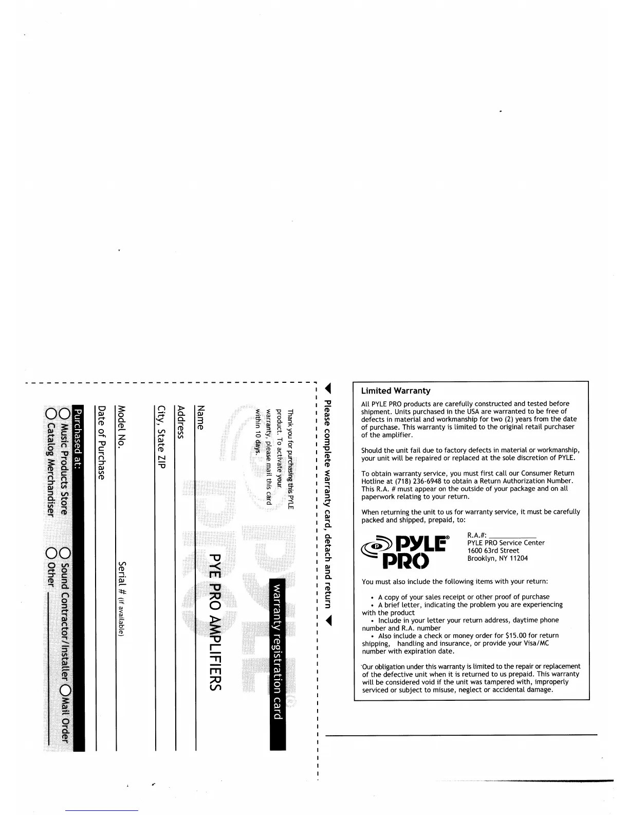 Pyle Pro PZR6XA - Warranty Registration Card