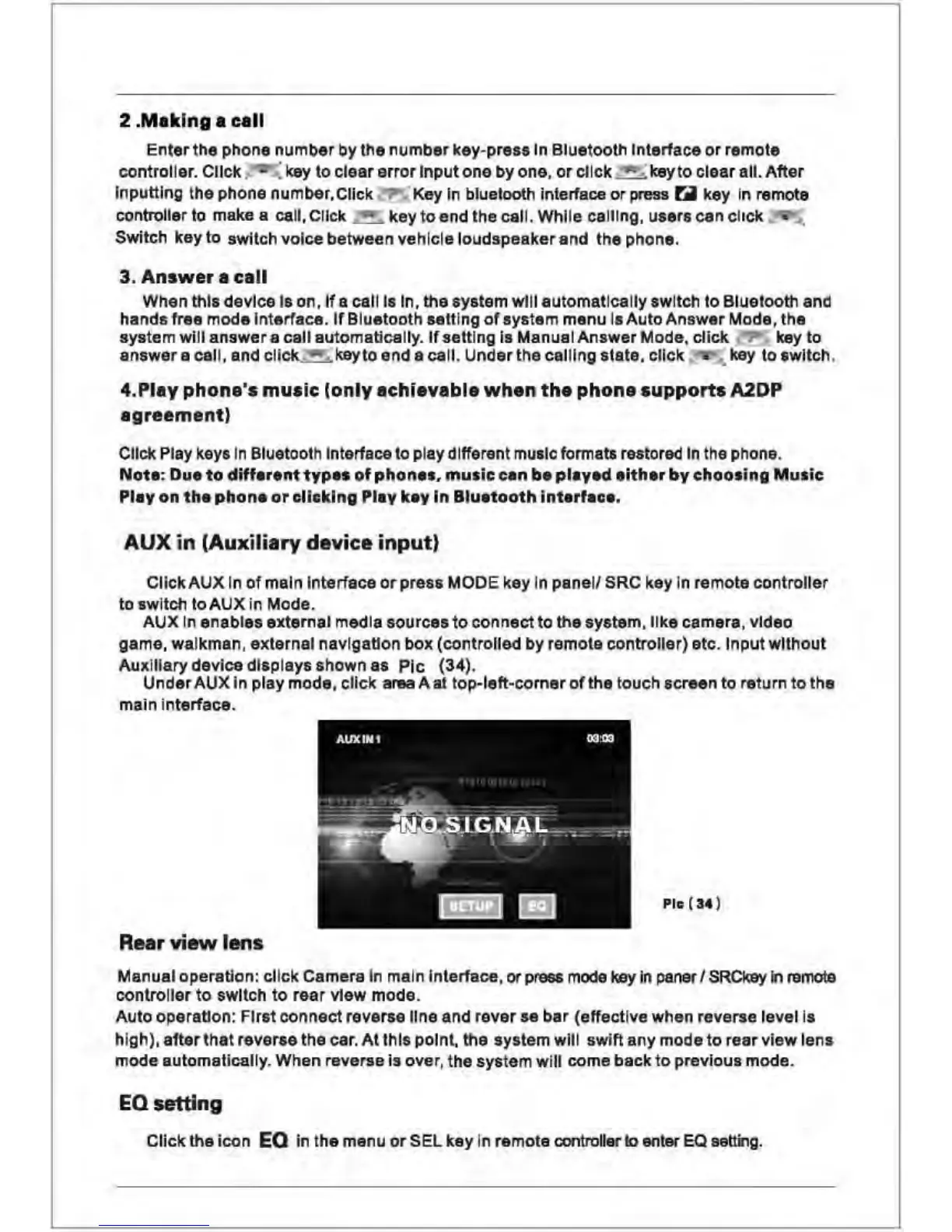 Pyle view PLDN73I - Bluetooth and Auxiliary Functions; Making and Receiving Calls; Playing Phone Music; Auxiliary Device Input