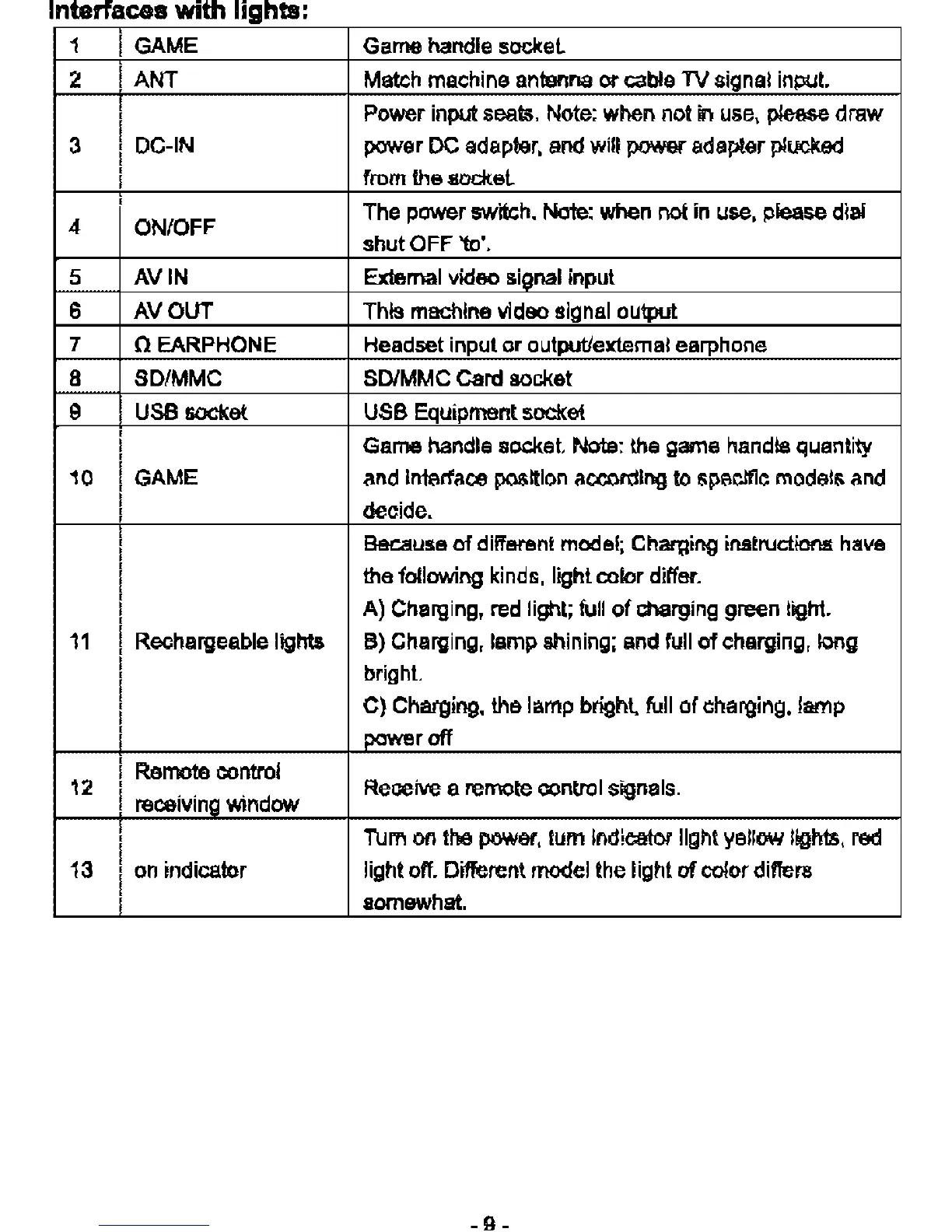 Rechargeable lights 8) Charging, lamp shining;