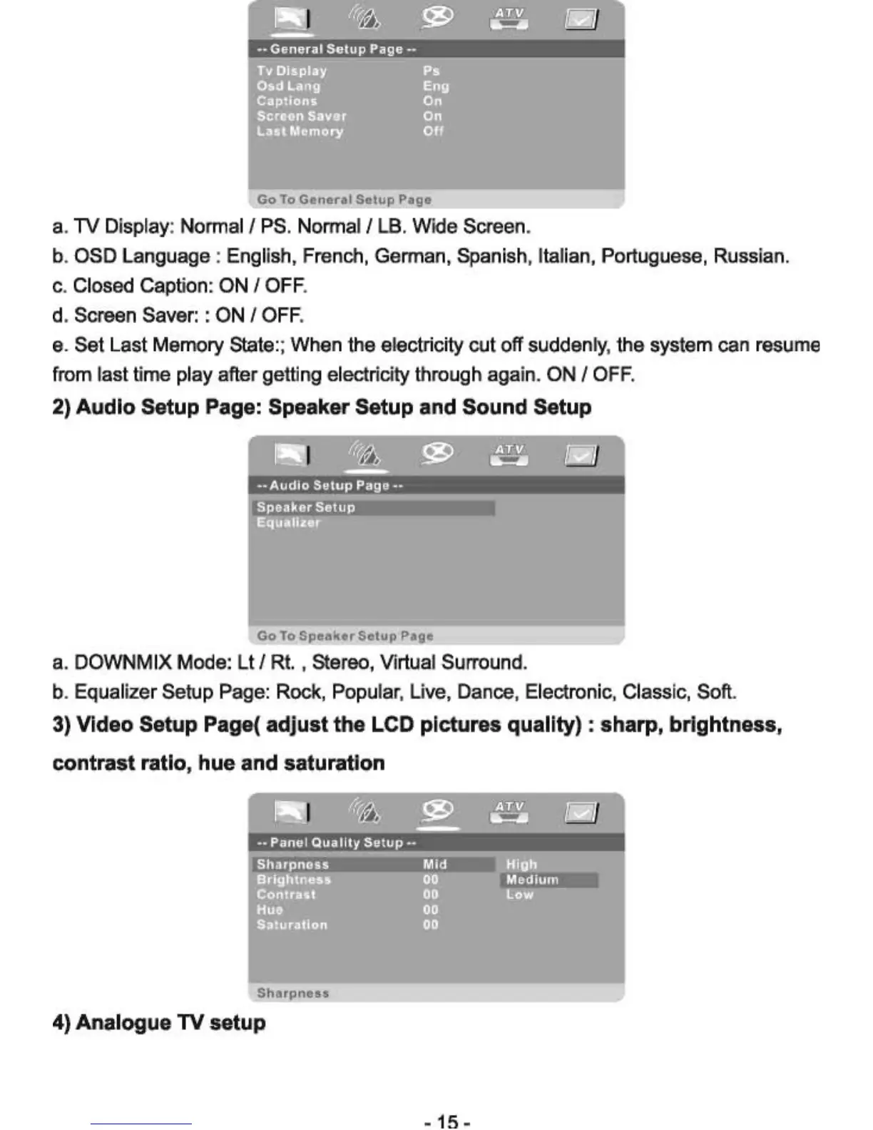 3) Video Setup Page( adjust the LCD pictures quality) : sharp, brightness,