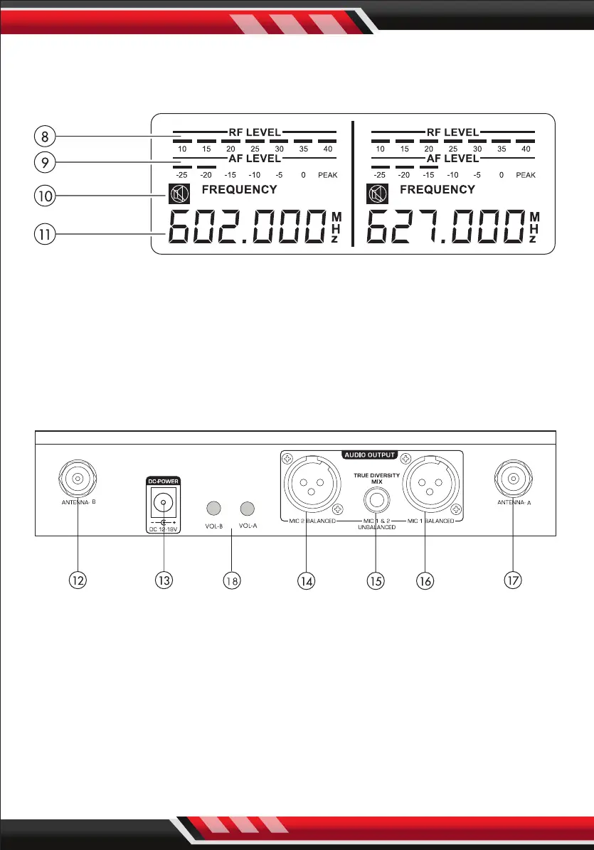 15. MIXED OUTPUT: Unbalanced 1/4" audio output for MIC 1 & MIC 2.