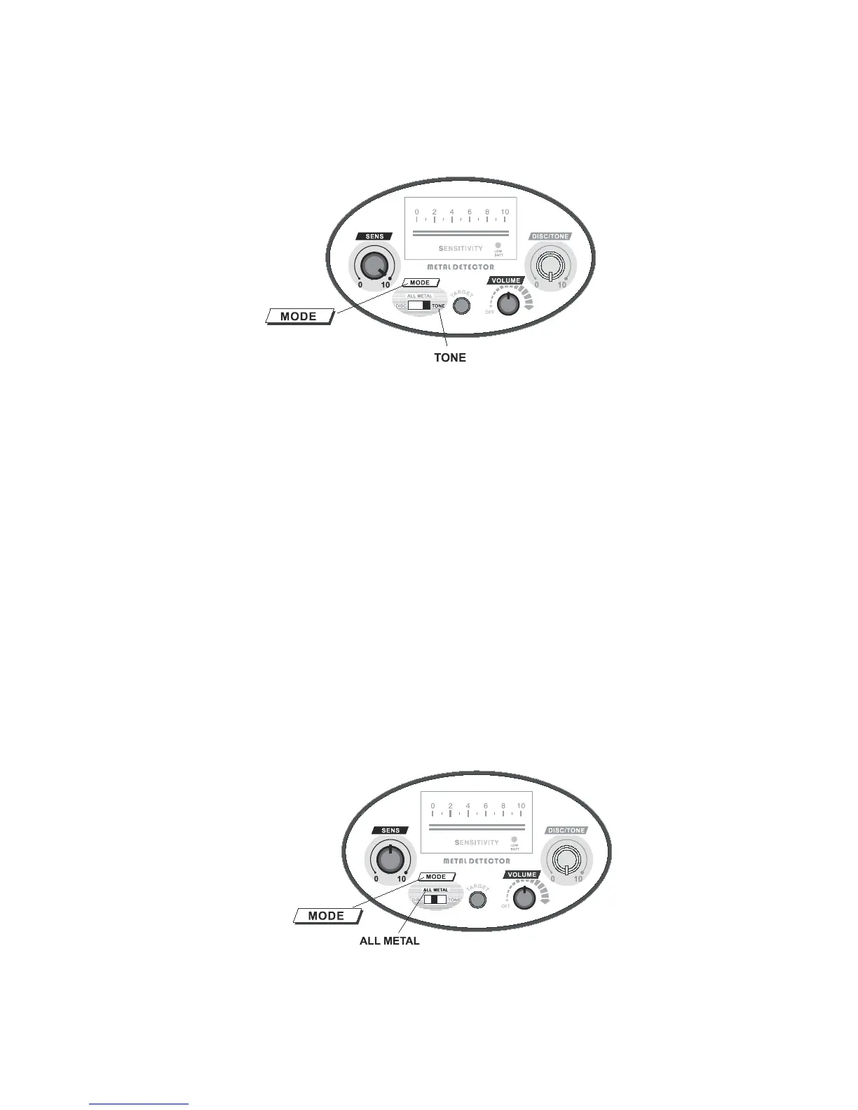 Set the MODE switch to “ALL METAL”,“VOLUME” and “SENS” to the mid