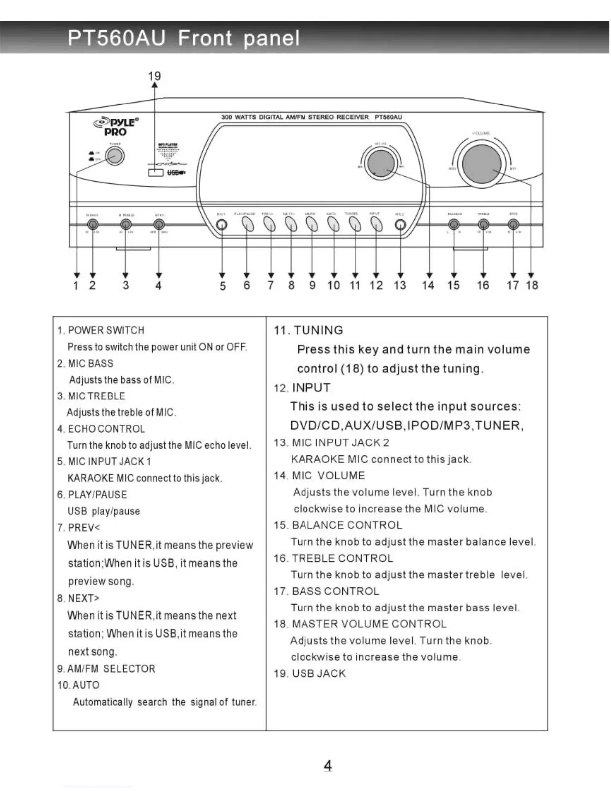 Pyle PT560AU - Front Panel Controls; Power and Master Volume Controls; Microphone Controls and Inputs; Media and Tuning Functions