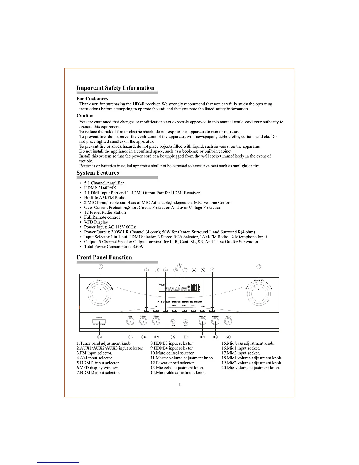 Pyle PT590AU - Important Safety Information; System Features; Front Panel Function