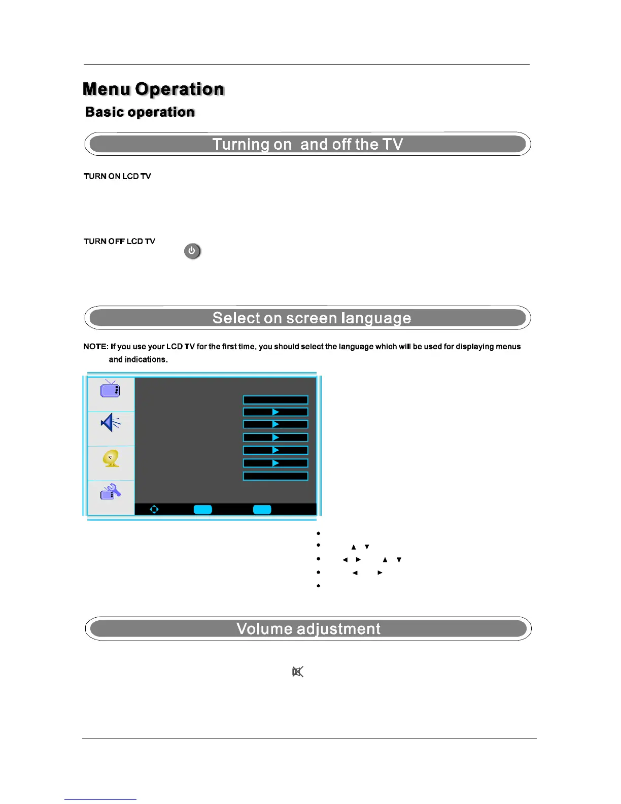 1.ConnectingtotheACinputcablethenpressthemainpowerswitchtoswitchONLCDTV.AtthistimetheTVwillenter