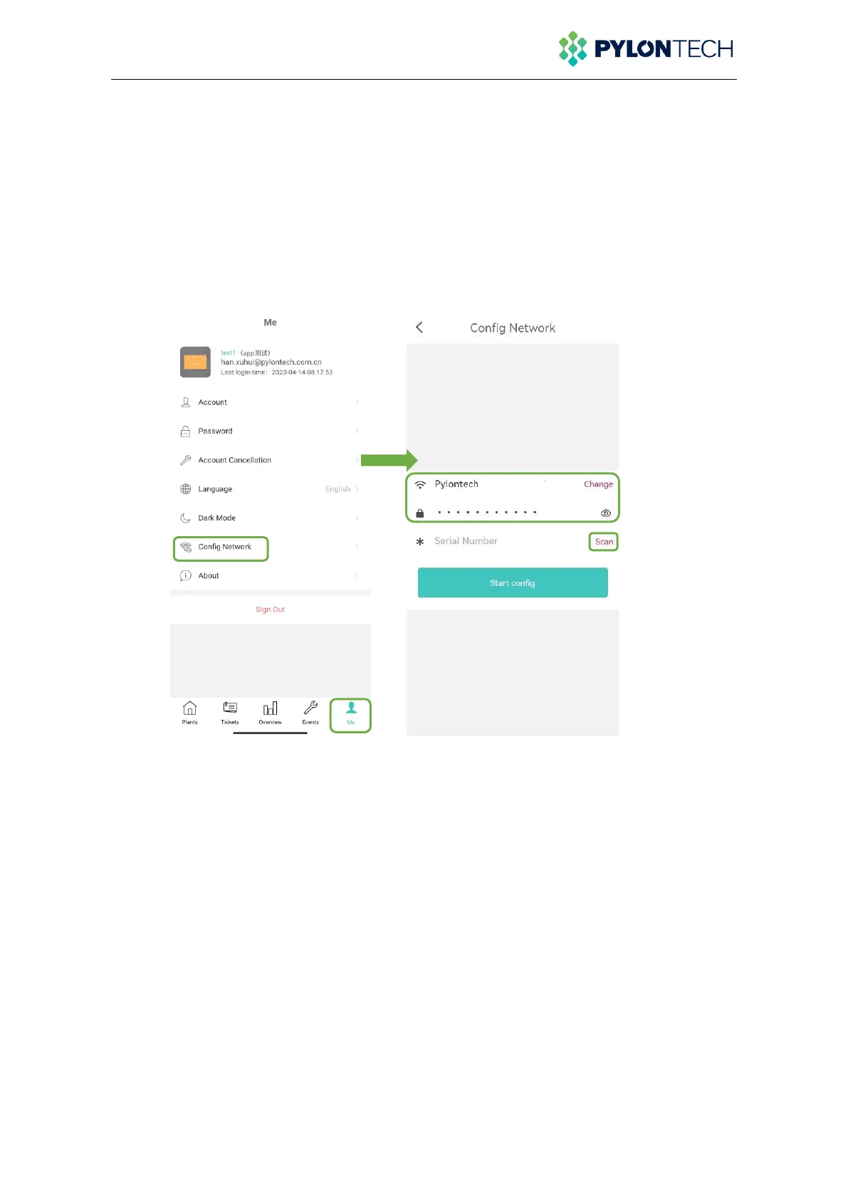 (3) After logging in to the Pylontech Home App, enter the "Me" page and select "Config Network".