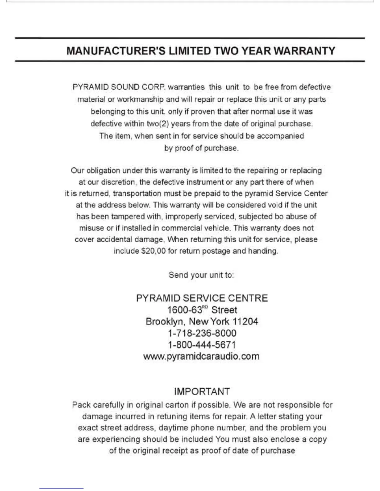 Pyramid BNPS102 - Manufacturers Limited Two Year Warranty; Warranty Service and Return Instructions