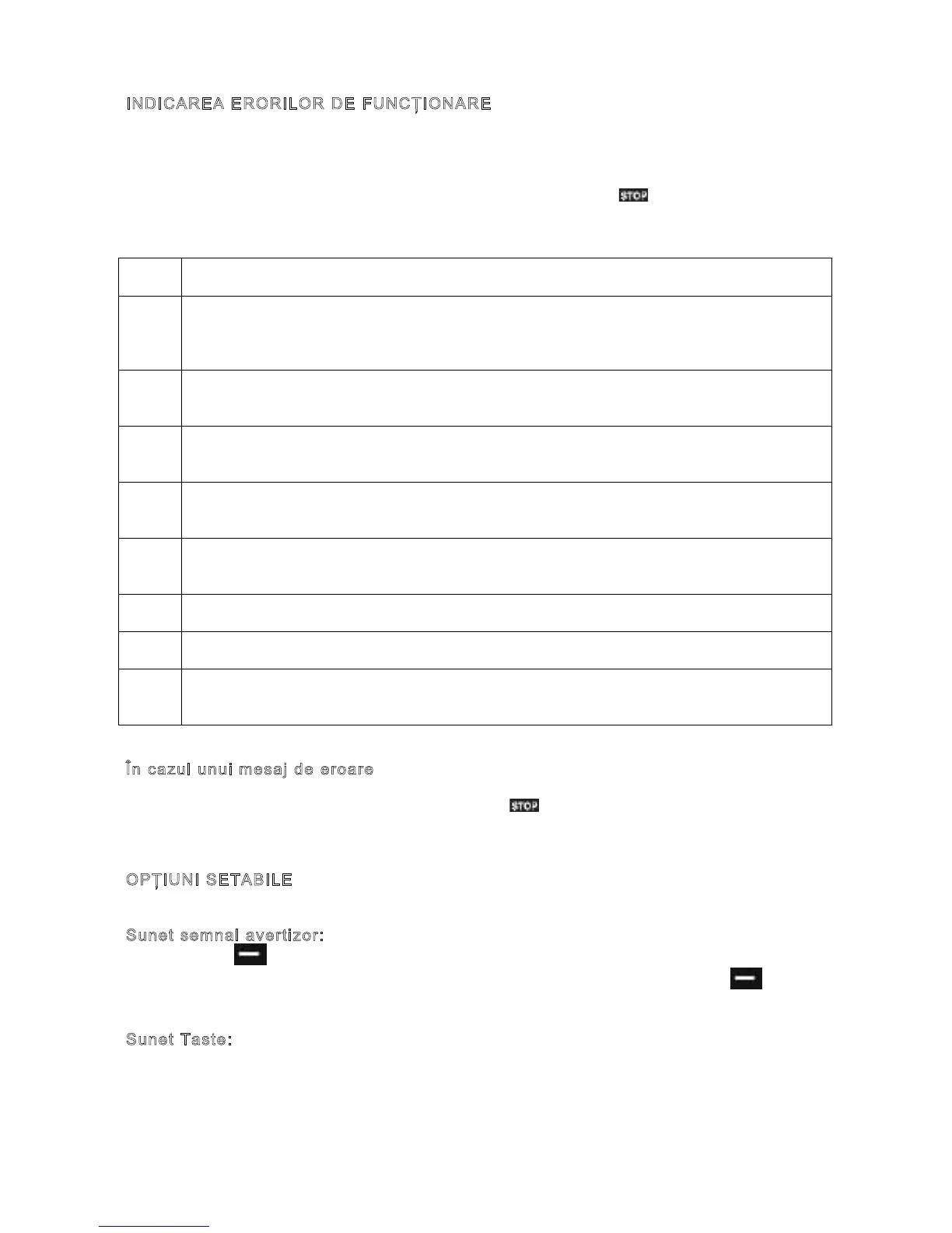 funcţionare, mesajul de eroare va fi afişat până la atingerea tastei . Există 8 erori posibile,
