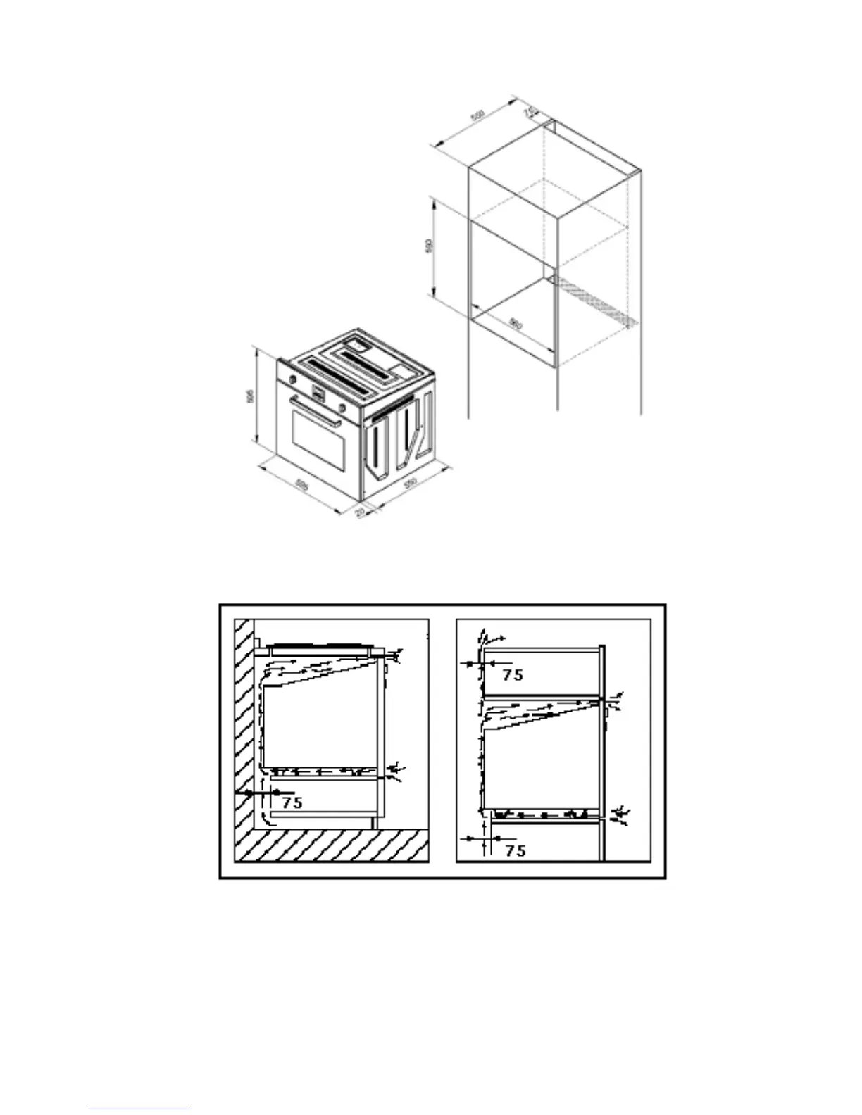 където монтирате фурната. Минималното разстояние между тялото и стената трябва да
