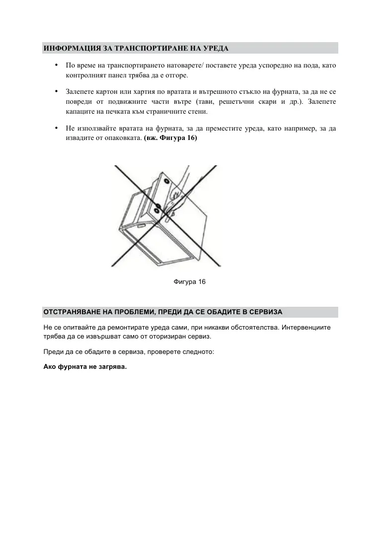 • По време на транспортирането натоварете/ поставете уреда успоредно на пода, като