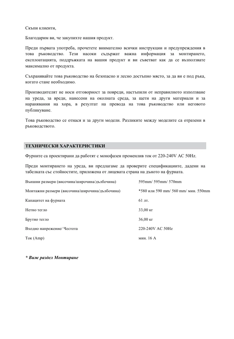 Монтажни размери (височина/широчина/дълбочина) *580 или 590 mm/ 560 mm/ мин. 550mm