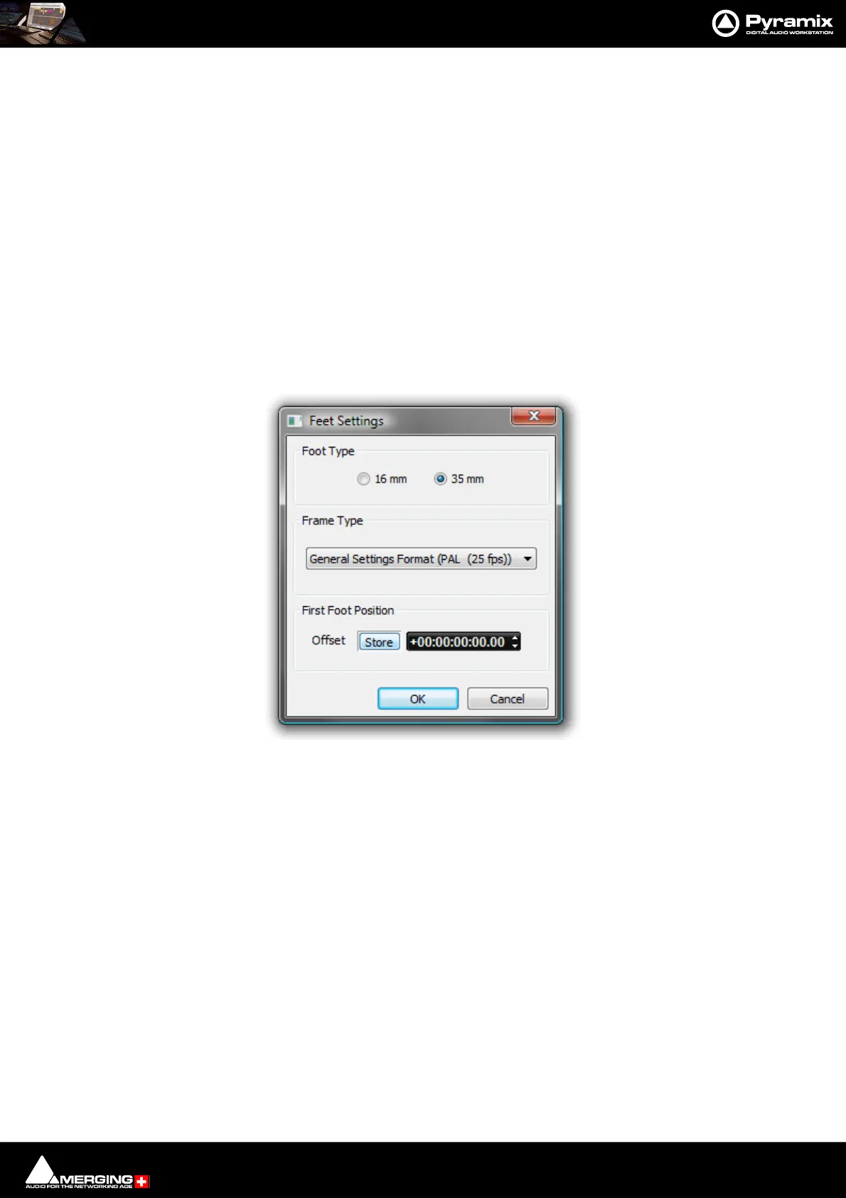 The radio buttons offer a choice of 16mm feet (units of 40 frames) and 35mm feet (units of 16 frames).