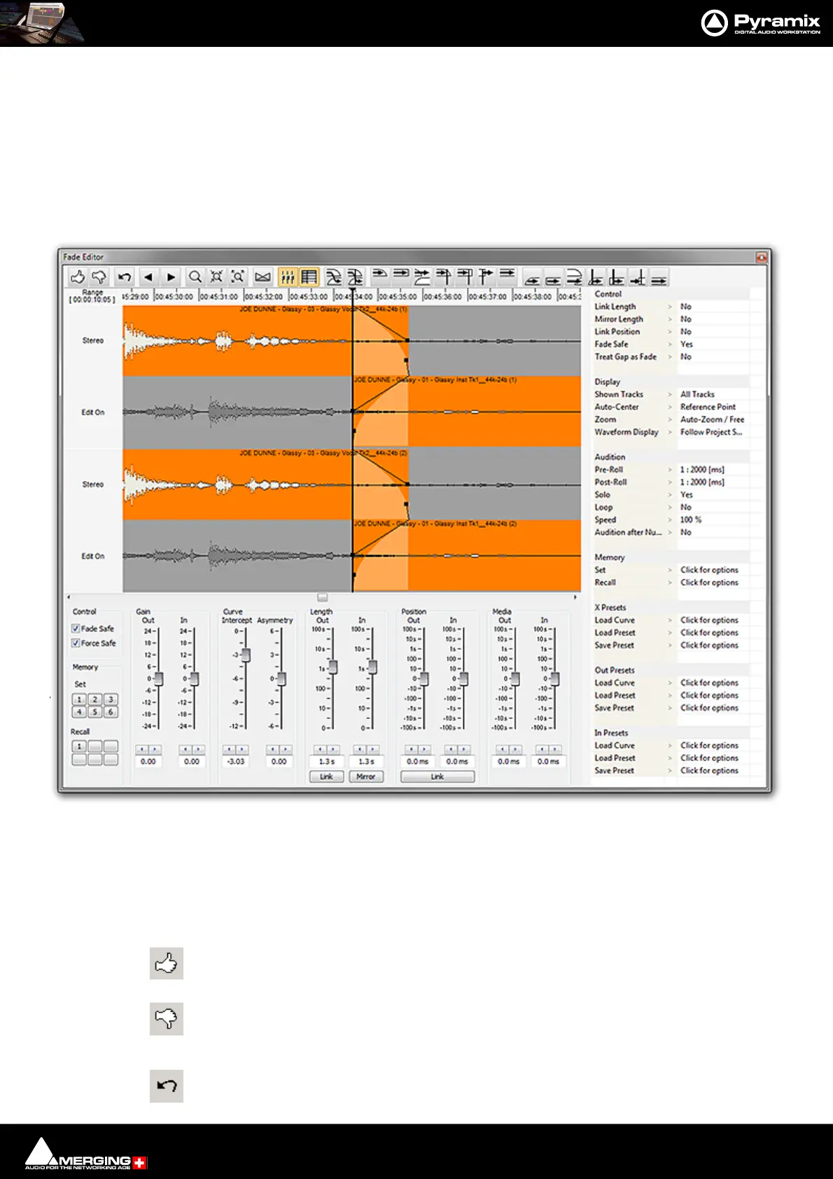 The Pyramix Fade Editor offers several methods for creating fades and cross-fades. Fades can be made graphically