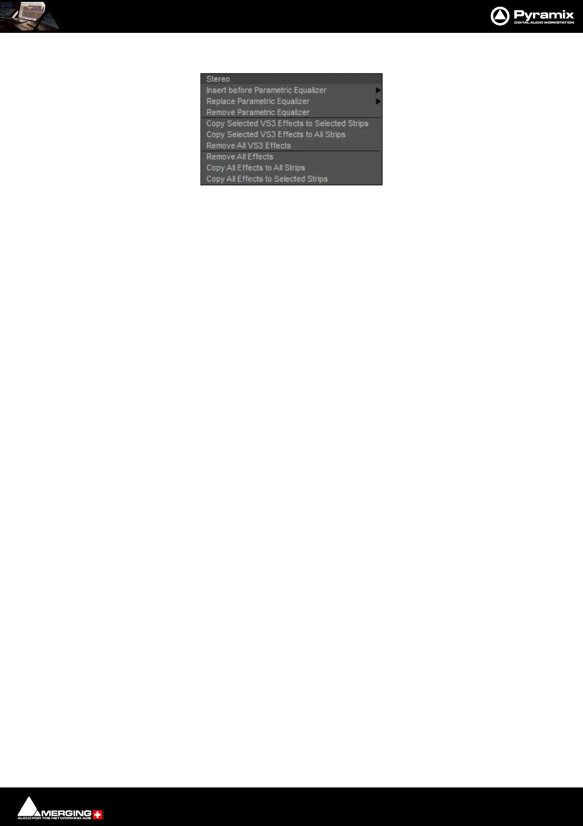 Remove (effect clicked on) Uninstalls the current effect from the Strip or Bus