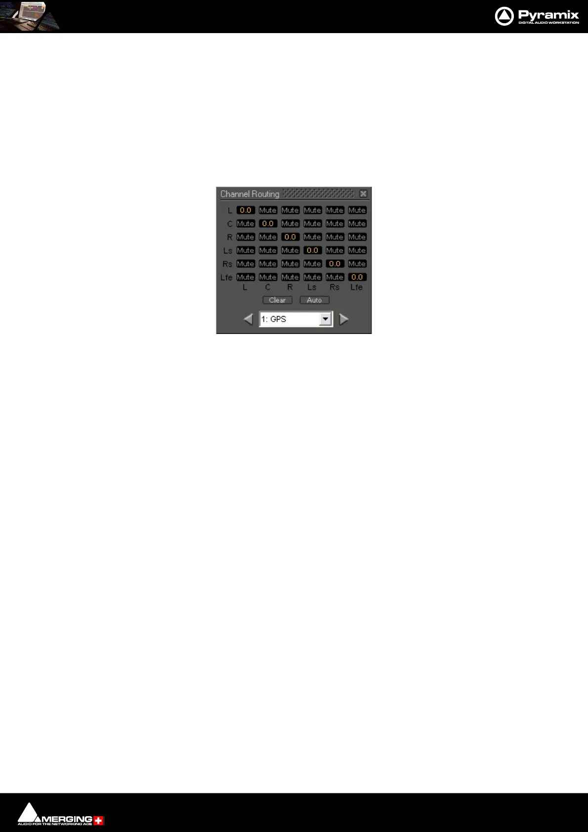 Shown here with a 5.1 channel feeding a 5.1 Aux Send Bus. Gain values can be entered for each node of the Strip/