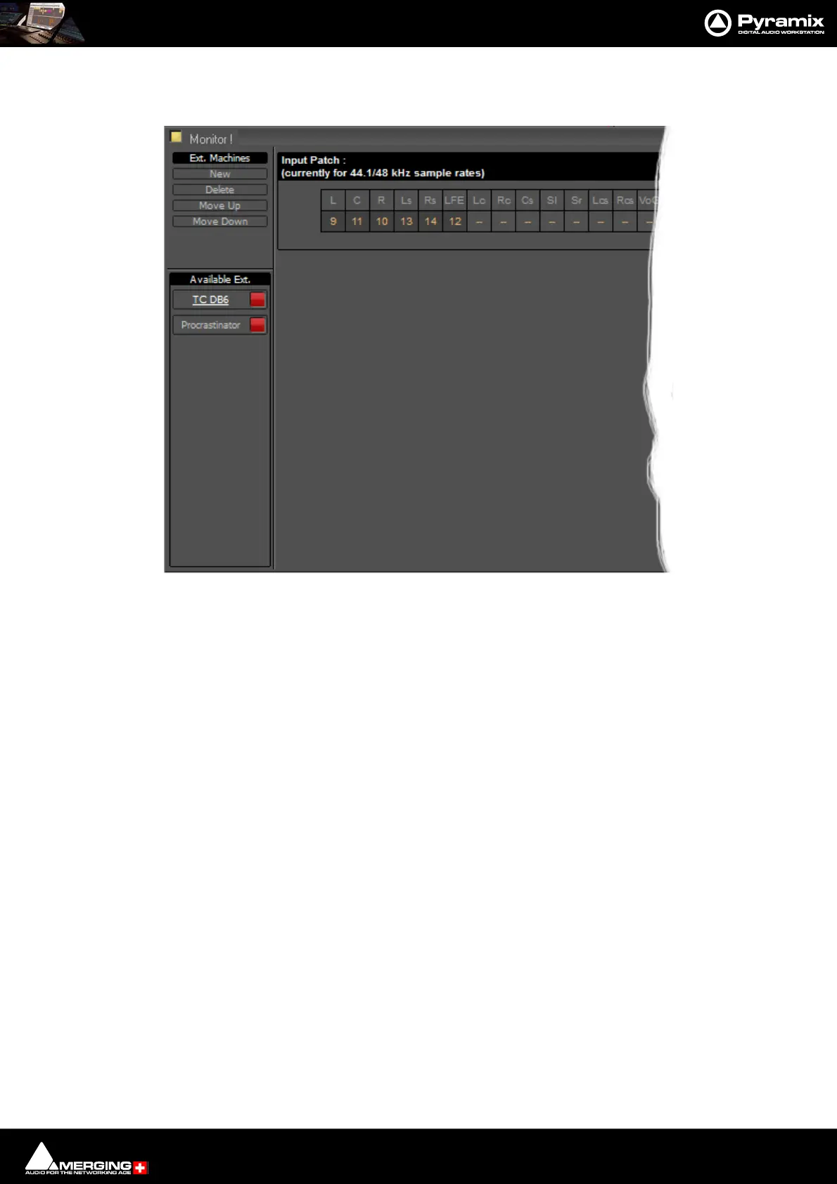 Each external has a dedicated input Patch. Patches are set up by clicking in the boxes below the speaker letters