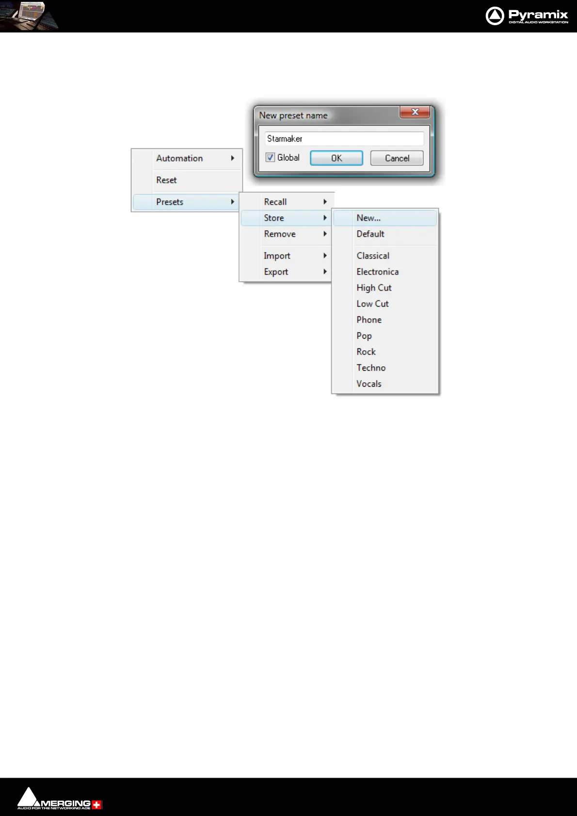 Creating a new preset stores a snapshot of the current values. Store > New opens the New Preset Name dialog