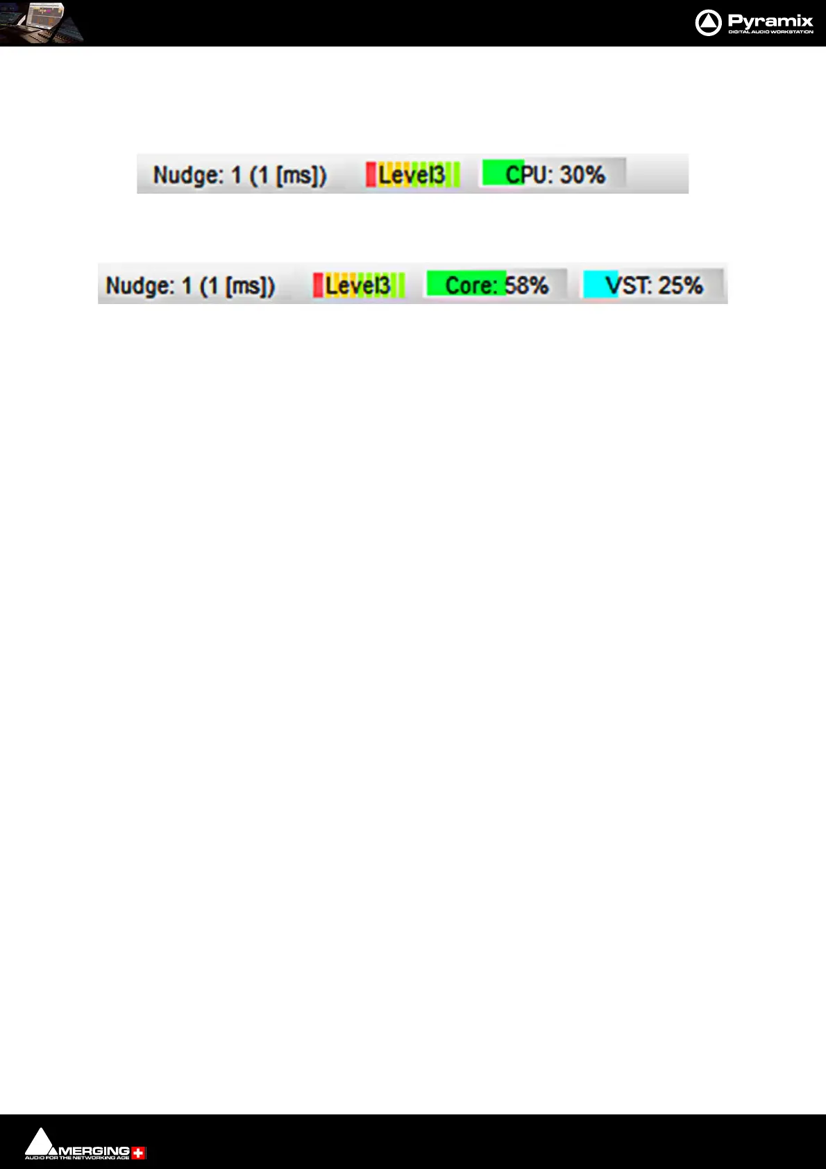 (Blue bar, orange when heavily loaded, red when overloaded): Indicates VST core load for VST processing.