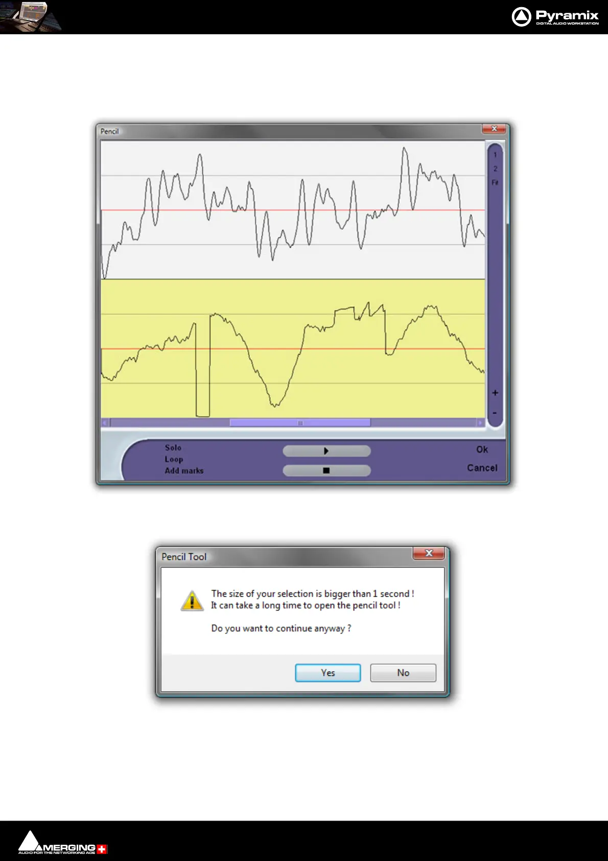 Note: If you select a section of audio longer than 1 second this Pencil Tool dialog will appear: