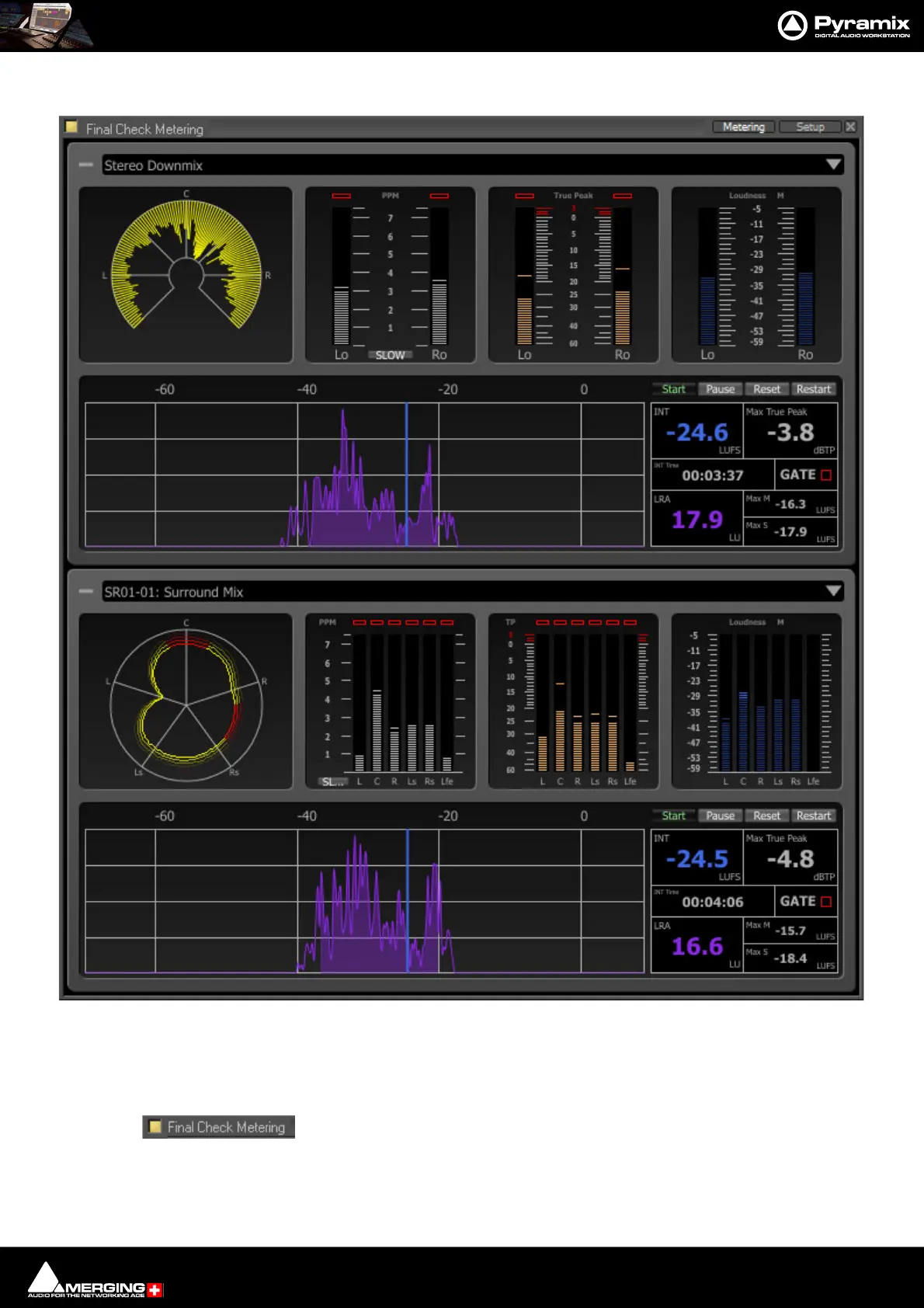 The Metering page is divided between the upper Stereo-panel and the lower Surround-panel. If one panel is not