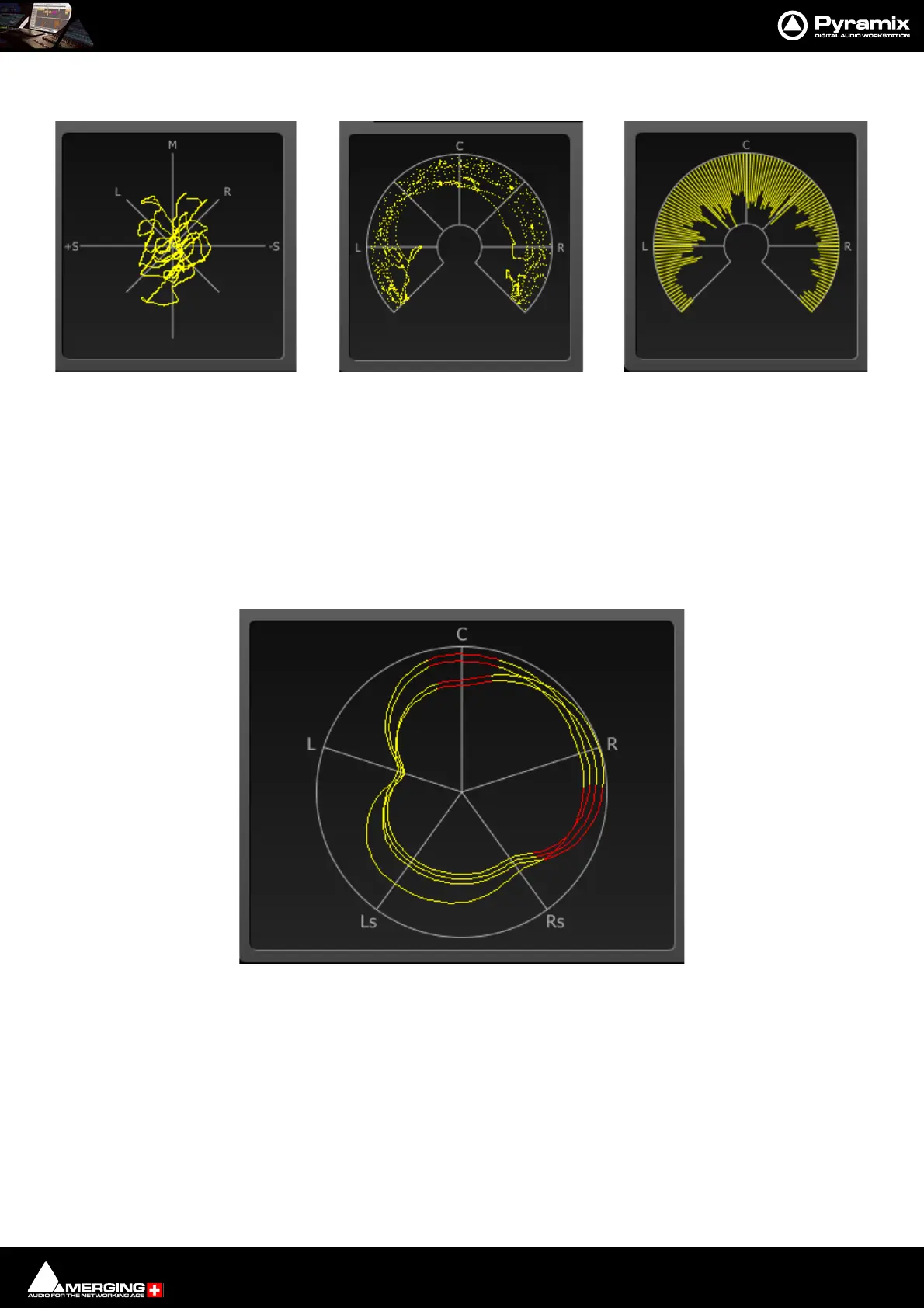 This meter shows a true 360° display of your surround-mix. With the added feature of a simple colour code allow-