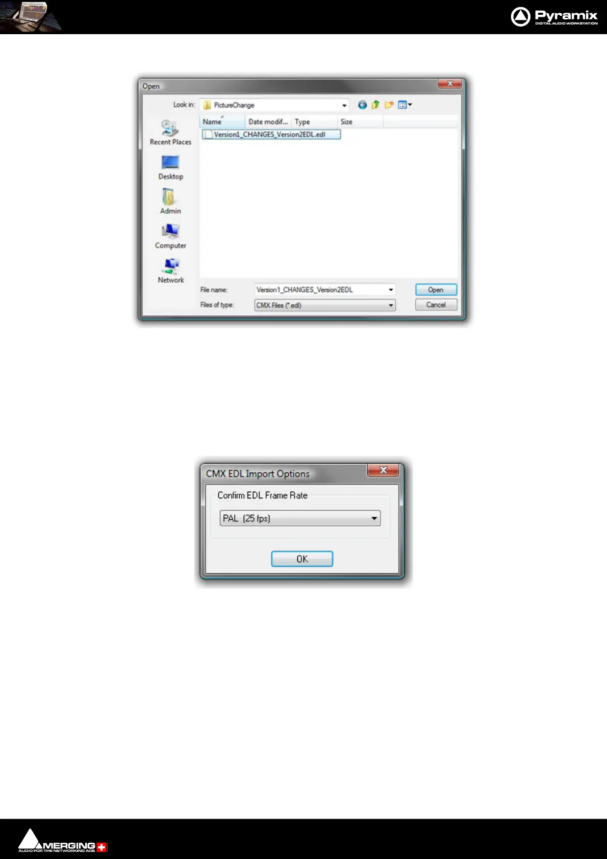 Check that the EDL Frame Rate matches the Pyramix Project Frame Rate. If the Frame Rate is incorrect, choose the