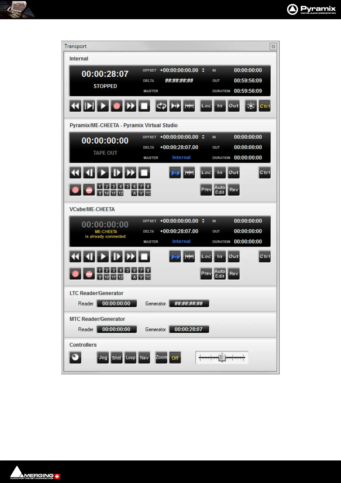 Transport Control Panel. In the example above the remote Pyramix on machine ME-CHEETA is already connected