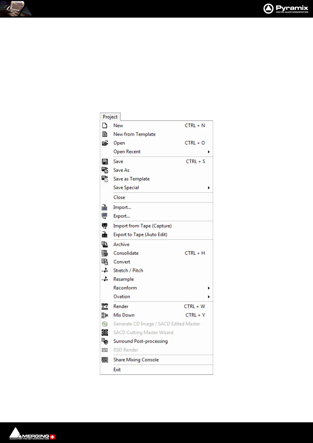 Many Pyramix menu entries are self-explanatory. These are simply listed. Other menu entries are either described