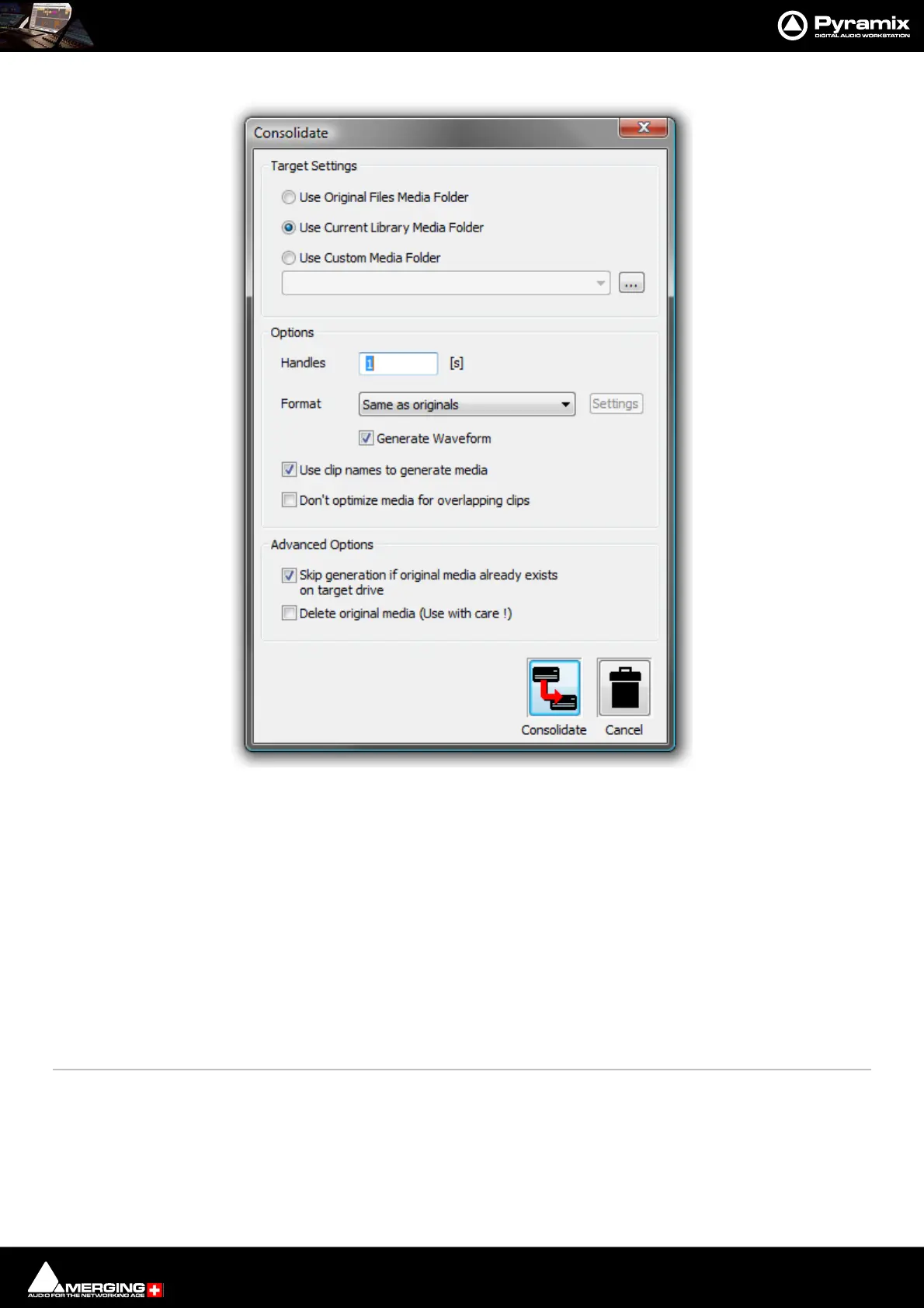 backing up the whole of every media file referenced by the Clips in a composition, Consolidate backs up only