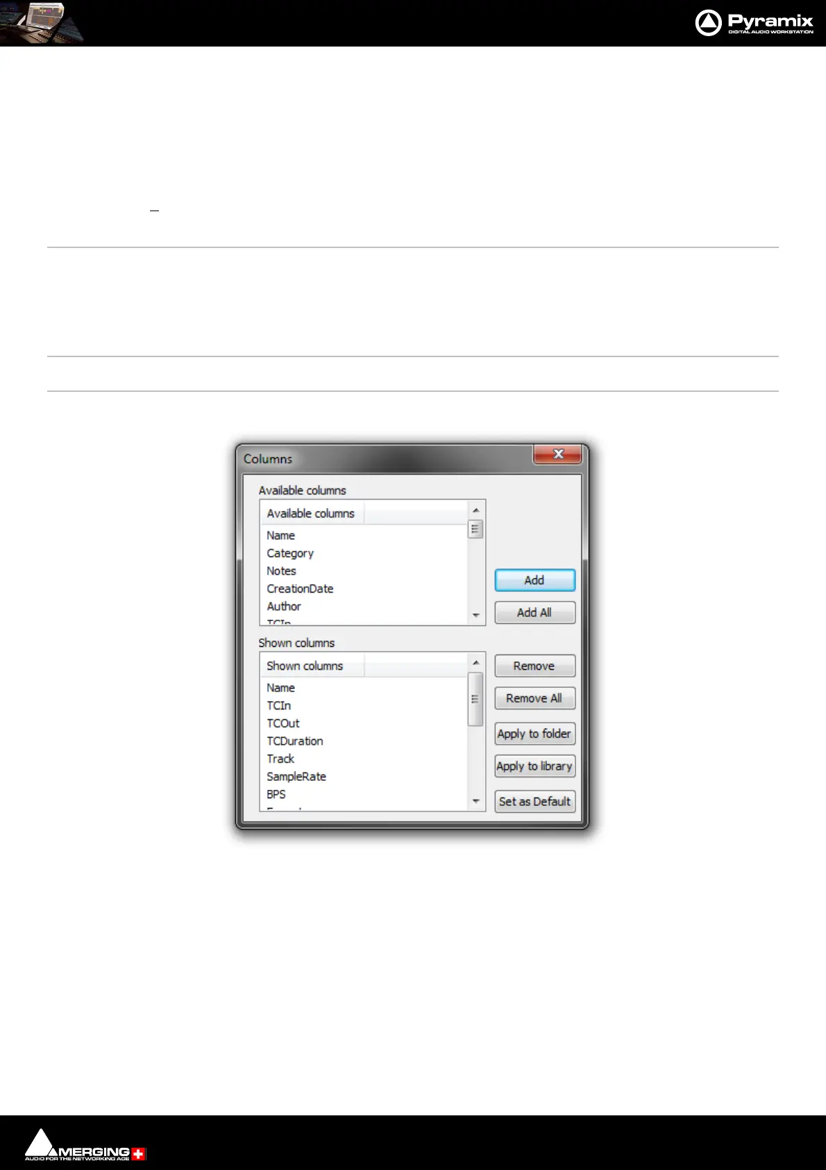 Add Adds the column(s) selected to the Shown columns list