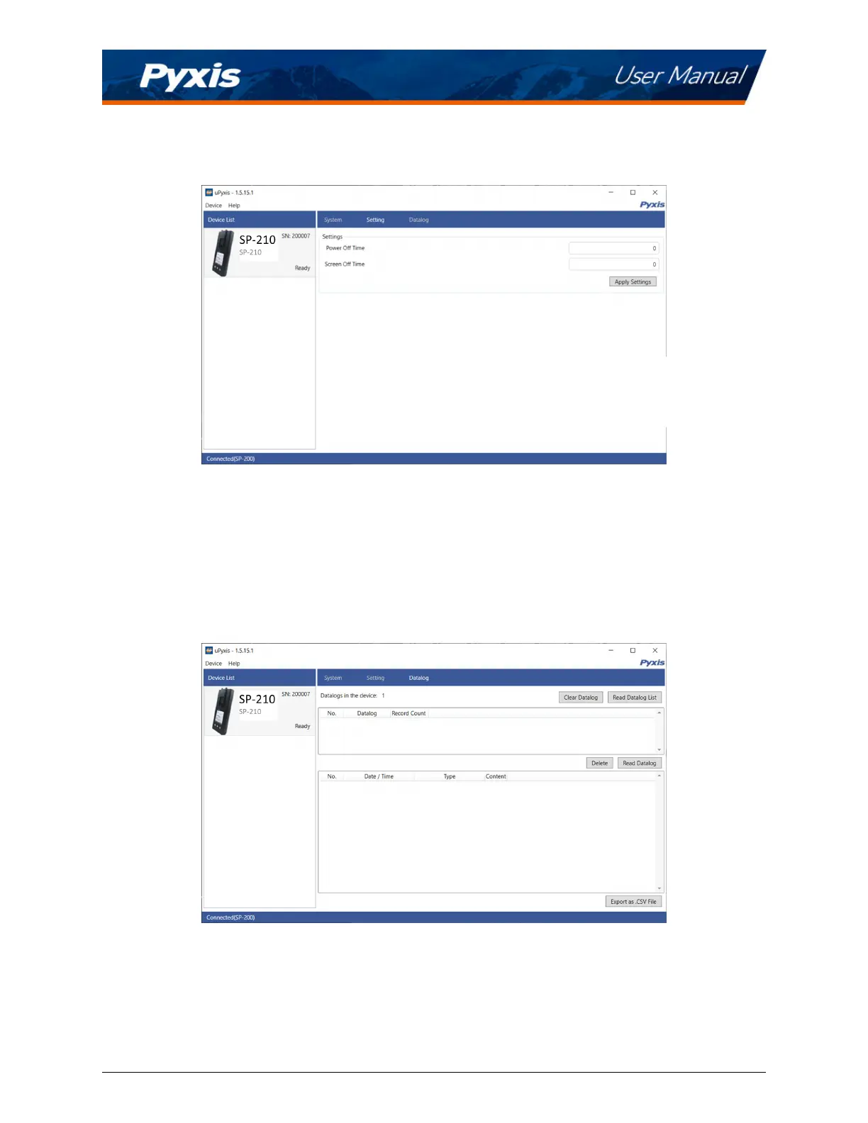 From the Datalog screen, the user can view, delete, and export the internal log les of the SP-210 by clicking