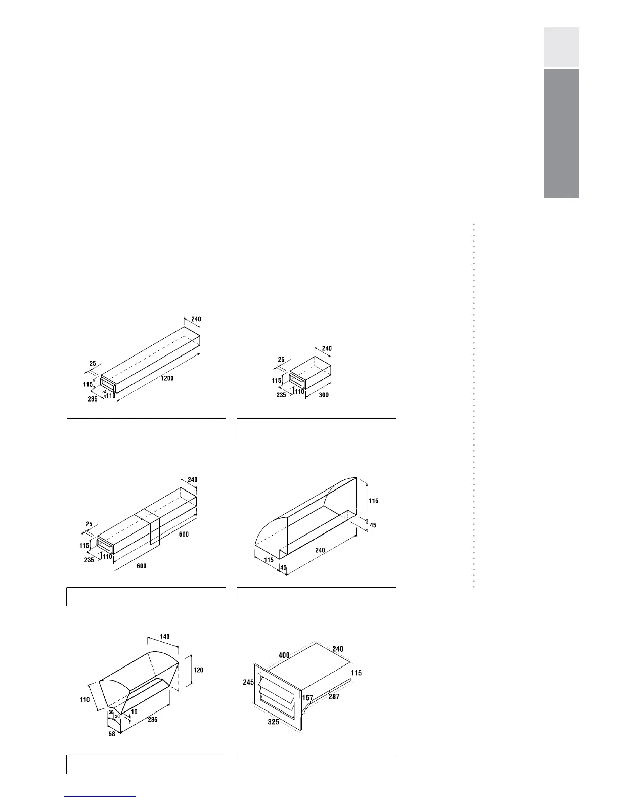 The following pages show all the ducting pieces available. They are made in zinc-alume and are non-