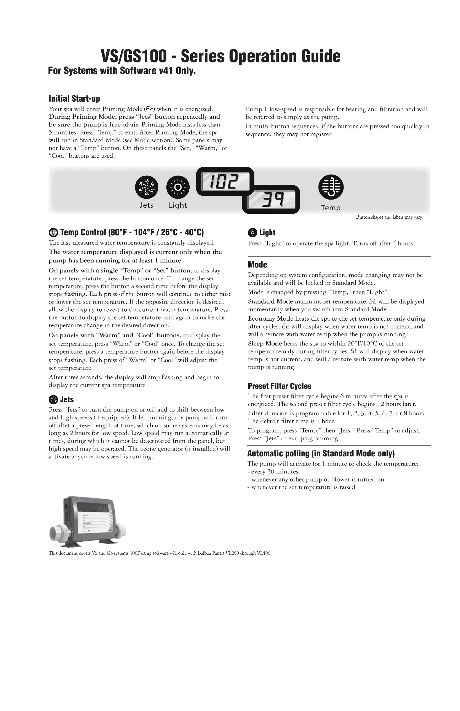 QCA Spa VS100 - VS;GS100 - Series Operation Guide; Initial Start-up; Temp Control; Jets
