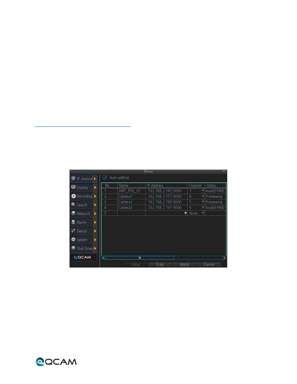 your NVR such as channel number, IP address, and status. Below is a screenshot of the IP Channel Menu:
