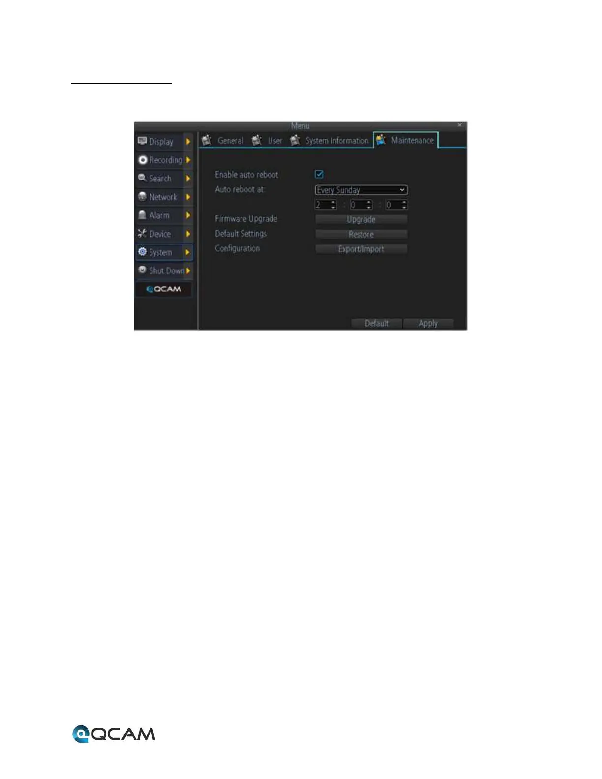 • Default Settings: This button allows the user to restore the NVR’s firmware to its factory default settings.